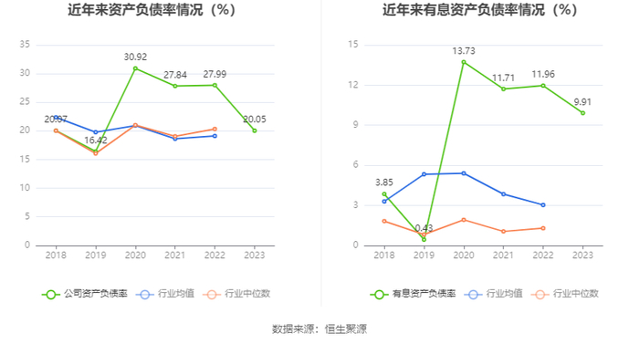在偿债能力方面,公司2023年年末资产负债率为20.05%,相比上年末下降7.94个百分点;有息资产负债率为9.91%,相比上年末下降2.05个百分点。