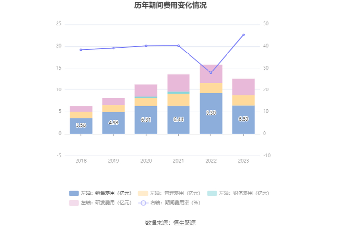 2023年,公司期间费用为12.49亿元,较上年同期减少3.27亿元;但期间费用率为45.16%,较上年同期上升17.42个百分点。其中,销售费用同比下降30.08%,管理费用同比下降0.32%,研发费用同比下降9.75%,财务费用由去年同期的-69.80万元变为-640.50万元。