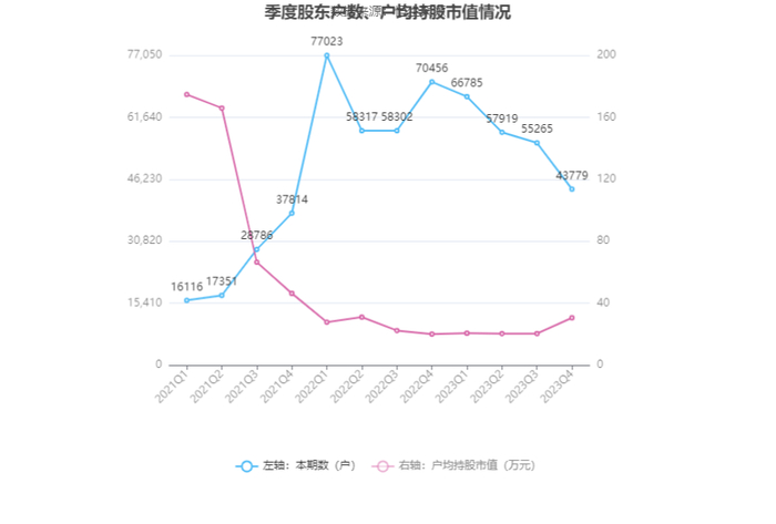筹码集中度方面,截至2023年年末,公司股东总户数为4.38万户,较三季度末下降了1.15万户,降幅20.78%;户均持股市值由三季度末的20.45万元上升至30.63万元,增幅为49.78%。