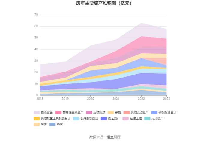 资产重大变化方面,截至2023年年末,公司其他流动资产较上年末增加4110.41%,占公司总资产比重上升11.02个百分点;债权投资合计较上年末减少70.31%,占公司总资产比重下降7.72个百分点;货币资金较上年末减少27.72%,占公司总资产比重下降3.89个百分点;交易性金融资产较上年末减少22.99%,占公司总资产比重下降2.37个百分点。