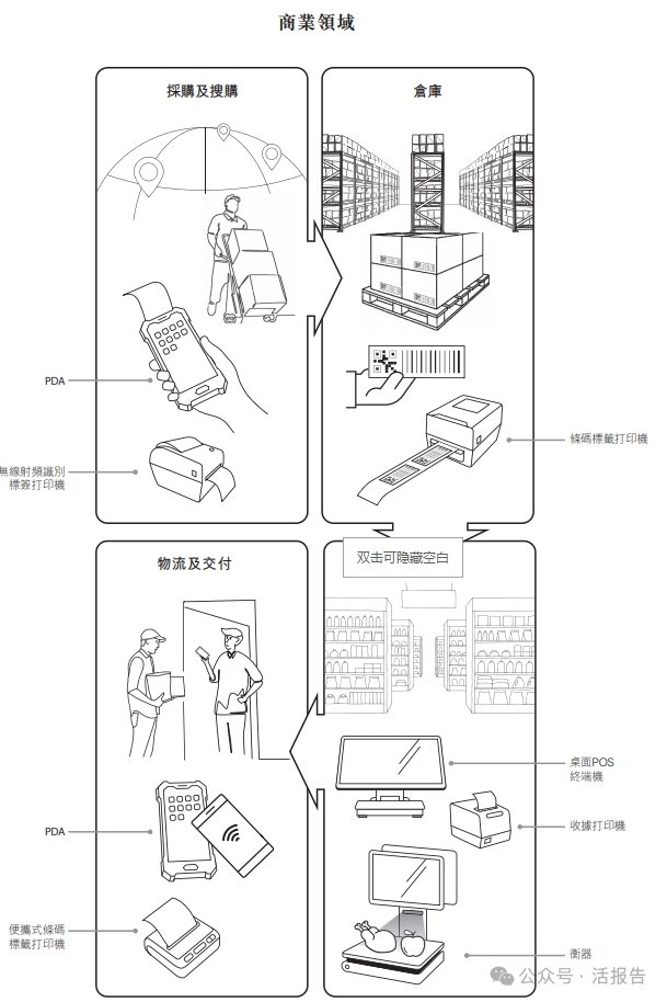 AIDC装置(包括公司的产品)用于自动识别物件、收集数据并将数据转输至系统,其广泛用于各行各业。为方便说明,下图载列公司的产品目前如何用于一般商业场景: