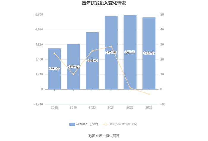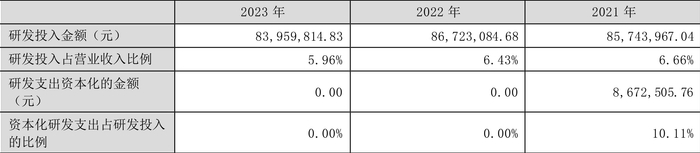 2023年全年,公司研发投入金额为8395.98万元,同比下降3.19%;研发投入占营业收入比例为5.96%,相比上年同期下降0.47个百分点。此外,公司全年研发投入资本化率为0。