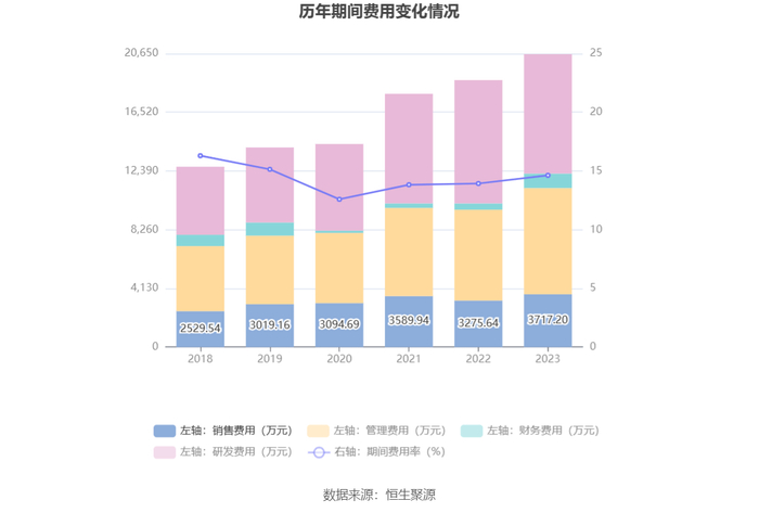 2023年,公司期间费用为2.06亿元,较上年同期增加1821.89万元;期间费用率为14.63%,较上年同期上升0.70个百分点。其中,销售费用同比增长13.48%,管理费用同比增长16.99%,研发费用同比下降3.19%,财务费用同比增长128.01%。