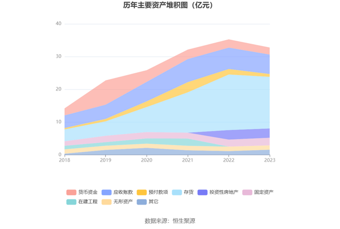 从存货变动来看,截至2023年年末,公司存货账面价值为15.75亿元,占净资产的87.89%,较上年末减少1.22亿元。其中,存货跌价准备为1906.55万元,计提比例为1.2%。