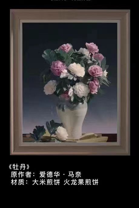 徐海霞的创新不止于此,2022年,她又用煎饼花插瓶加上布景摆拍还原出了世界名画,包括梵高的《向日葵》、莫奈的《牡丹瓶花》、达利的《冥想玫瑰》、马奈的《牡丹》、拉图尔的《玫瑰花和水果》。