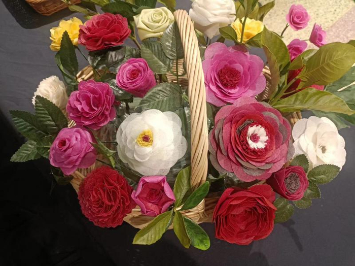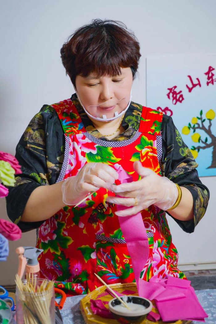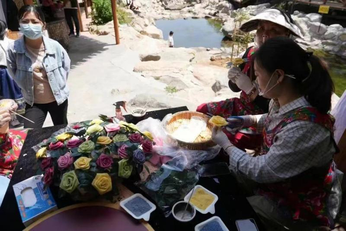 做好了山水画,徐海霞还和徒弟做起了煎饼花,4月20日,这些作品一同在蒙阴县第二届沂蒙煎饼文化旅游体验季活动中展出。在活动现场,徐海霞向游客展示如何用煎饼作画,她店里的员工则为大家展示如何做煎饼花。“游客看了都夸我们手太巧了,还说我们简直是艺术家,我听着心里美得很。其实做煎饼花并不难,但由于场地比较小,游客只是看,没有亲自上手体验。”