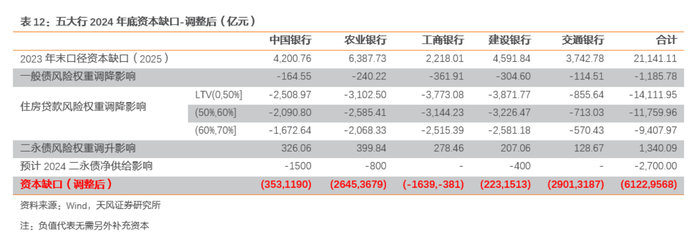在不考虑二永债融资和存保基金计入的情况下,目前多数机构对2025年大行TLAC达标缺口的测算在万亿元以上。另据天风证券测算,将资本新规各方面权重调整影响和2024年二永债净融资规模考虑在内,不考虑存保基金计入TLAC比率,五大行距离2025年TLAC监管要求有6122亿~9568亿元的资本缺口。考虑交通银行第一阶段达标时间为2027年初,四大行调整后的资本缺口在3221亿~6382亿元之间。天风证券固收分析师孙彬彬认为,目前各行计划发行的TLAC债额度可能是第一阶段的实际TLAC缺口。