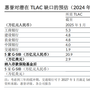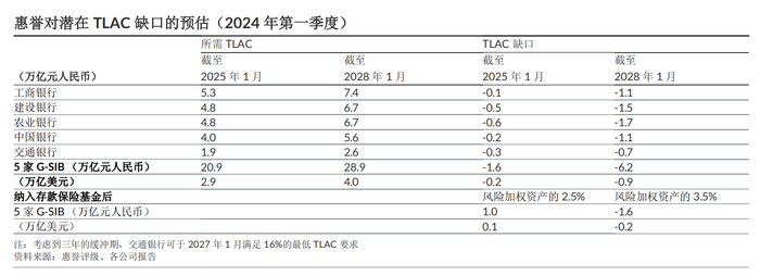 在此背景下,机构普遍对各行的TLAC达标缺口进行了测算。按照惠誉评级的预测,到2025年、2028年五大行面临的TLAC缺口将分别为1.6万亿元、6.2万亿元;按照上限纳入存保基金后,至2025年各行不存在TLAC缺口,至2028年则为1.6万亿元。
