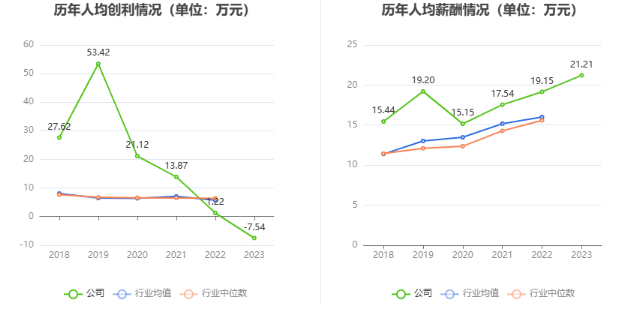 截至2023年末,公司员工总数为952人,人均创收93.56万元,人均创利-7.54万元,人均薪酬21.21万元,较上年同期分别变化12.76%、-716.55%、10.75%。