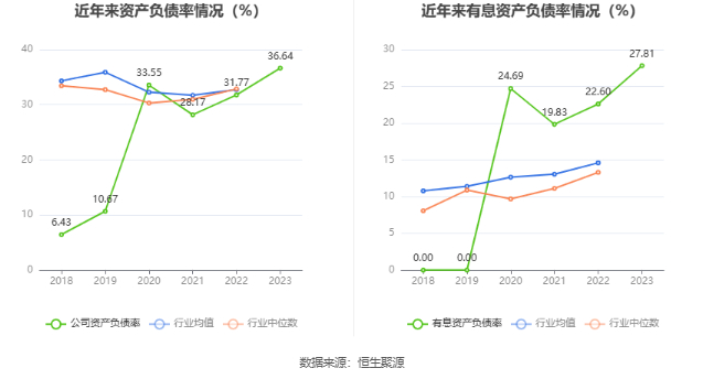 在偿债能力方面,公司2023年年末资产负债率为36.64%,相比上年末上升4.87个百分点;有息资产负债率为27.81%,相比上年末上升5.21个百分点。