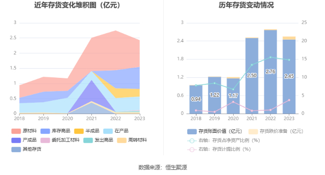 从存货变动来看,截至2023年年末,公司存货账面价值为2.45亿元,占净资产的14.83%,较上年末减少3136.25万元。其中,存货跌价准备为958.33万元,计提比例为3.77%。