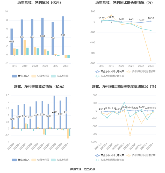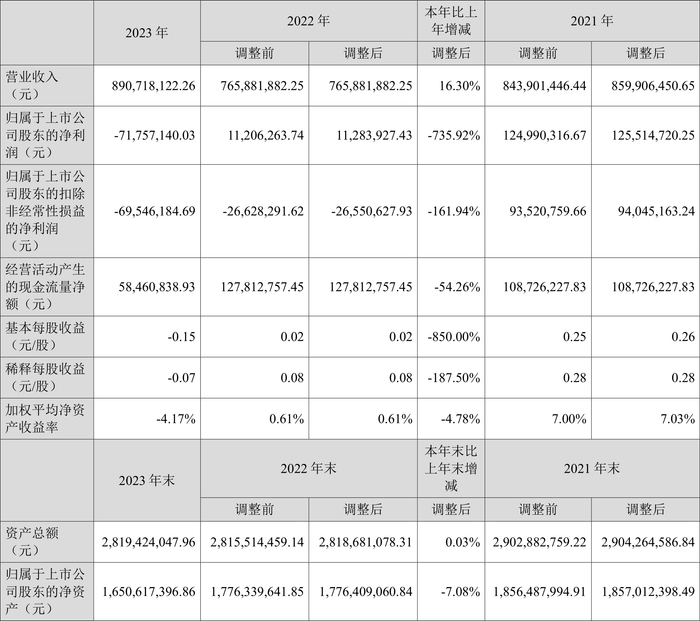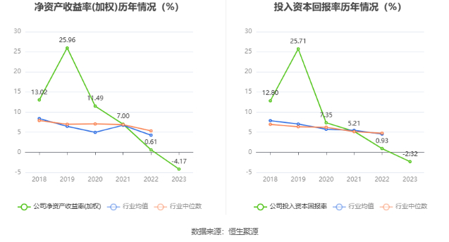 数据显示,2023年公司加权平均净资产收益率为-4.17%,较上年同期下降4.78个百分点;公司2023年投入资本回报率为-2.32%,较上年同期下降3.25个百分点。