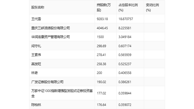 年报显示,2023年年末公司十大流通股东中,新进股东为广发证券股份有限公司、万家中证1000指数增强型发起式证券投资基金、陈柏林,取代了三季度末的中信证券股份有限公司、陈峰、大成景恒混合型证券投资基金。在具体持股比例上,王代雪、重庆三峡油漆股份有限公司、华润渝康资产管理有限公司、闫守礼持股有所下降。
