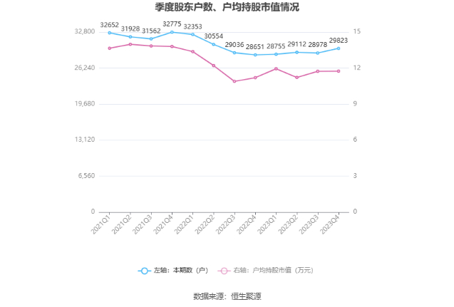 筹码集中度方面,截至2023年年末,公司股东总户数为2.98万户,较三季度末增长了845户,增幅2.92%;户均持股市值由三季度末的11.73万元上升至11.74万元,增幅为0.09%。