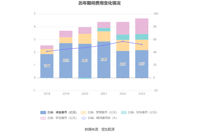 2023年,公司期间费用为4.65亿元,较上年同期增加2813.61万元;但期间费用率为52.25%,较上年同期下降4.84个百分点。其中,销售费用同比增长3.08%,管理费用同比下降4.61%,研发费用同比增长23.55%,财务费用同比增长5.43%。