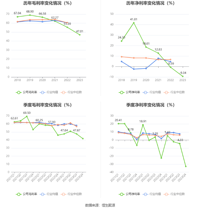 2023年,公司毛利率为47.01%,同比下降8.38个百分点;净利率为-9.34%,较上年同期下降8.75个百分点。从单季度指标来看,2023年第四季度公司毛利率为41.83%,同比下降4.31个百分点,环比下降5.84个百分点;净利率为-32.79%,较上年同期下降10.40个百分点,较上一季度下降28.46个百分点。