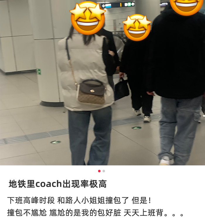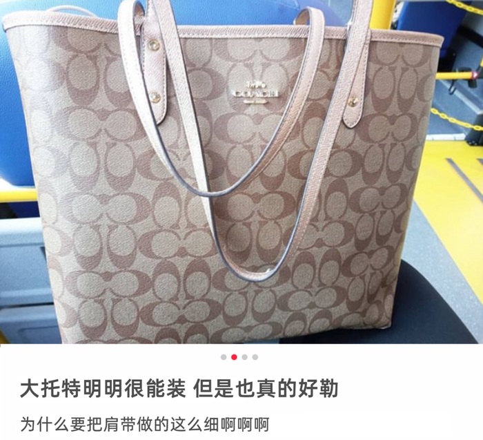 蔻驰的很多包型总是被吐槽肩带过细过长,装多了东西会把肩膀勒得生疼。但每天通勤的打工人则有经验之谈,“挤地铁正好把它挂在门边的扶手上,不碍事不挡人,也完全不会心疼。”