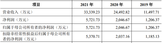 与招股书中公司对业务的描述相匹配,公司的业绩也非常靓丽。首次申报时,公司摆出的是2019年到2021年三年的财务数据,其中营业收入分别为1.15亿元、2.45亿元和3.33亿元,两年增长近两倍;净利润分别为1206万元、2046万元、5721万元,两年增长近4倍。