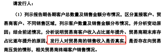 为此,深交所首先要求公司列示报告期各期客户总数量及销售金额分布情况,区分直接客户、贸易商客户、不同销售区域,列示客户数量及销售金额分布情况,并分析变动原因;结合前述情况,分析说明贸易商客户收入占比逐年提升、贸易商期末库存占比逐年提升的原因,公司对贸易商的销售收入是否真实,是否存在向贸易商压货的情形。