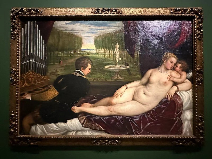 展览现场,提香作品《沉醉在爱与音乐中的维纳斯》