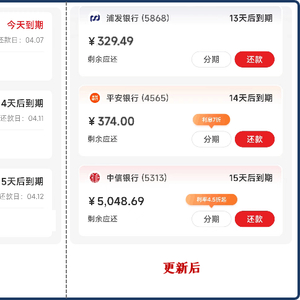 其次,这次更新主要体现在视觉效果上,更新前红色的“还款金额”和红色的“到期前预警”都是非常高价值的,因为在这个页面,用户核心诉求就是还款管理:用户需要清晰地看到欠款金额和到期还款日,以便做还款计划等。