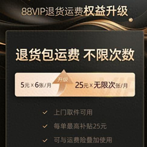 这是今年88VIP权益的一次重大升级。据了解,升级前,88VIP会员每月可享受6张5元退货券,升级后,每单退货最高补贴25元邮费,不限次数,并且可与运费险叠加使用。