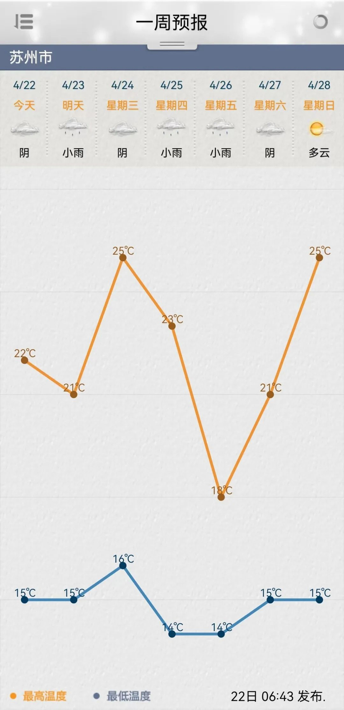预计苏州今天和25日夜里至26日白天有降水。今天下午多云,夜里多云转阴有短时阵雨;明天白天阵雨渐止转阴天,夜里阴转多云。雨量不太大,但市民需继续防范短时强降水、雷暴大风等强对流天气突袭。