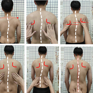 检查者:眼睛应与受检者背部在同一高度,目光平行随受检者弯曲由头至尾,从胸椎至腰椎,观察脊柱两侧是否高低不平。