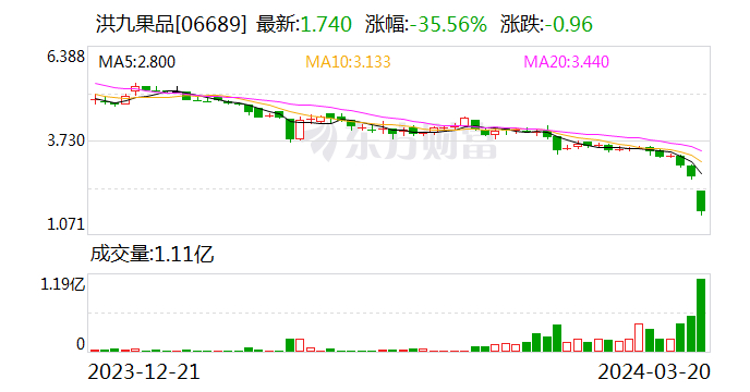值得关注的是,洪九果品年报“难产”。3月19日,洪九果品发布公告称,延迟刊发2023年年报,原因系公司需要更多时间提供核数师就审核全年业绩所要求的所有资料,解决核数师在审核过程中提出的该等事宜。