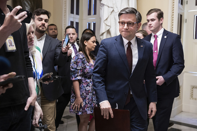 当地时间2024年4月20日,美国华盛顿特区,众议院在国会大厦通过一系列外援法案后,众议院议长迈克·约翰逊与记者交谈。