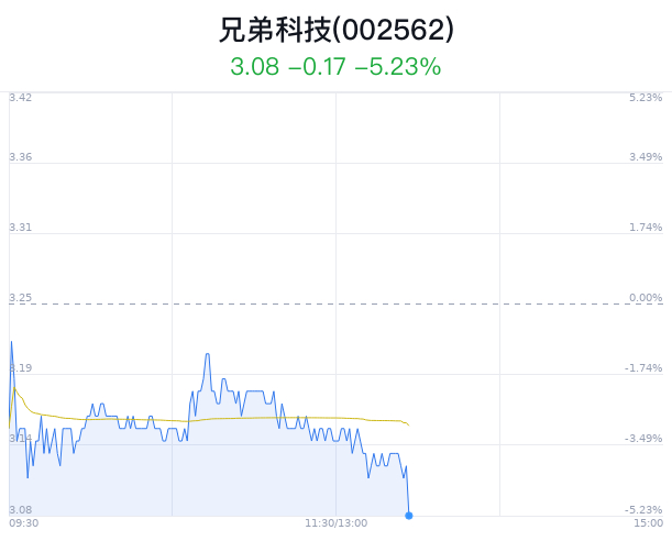 04月22日,兄弟科技(002562)股价大幅下跌,截至13点26分,兄弟科技下跌5.23%,报3.08元/股,成交6489万元,换手率2.94%,振幅4.62%。