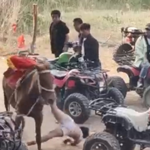 视频显示,一名身穿白色上衣的儿童被马拖行。孩子的一只脚卡在马镫上,身体朝下,脸在地面拖行。马拖着孩子先往远处跑又掉头往回跑,在此期间,孩子几次撞到了沙滩车上。