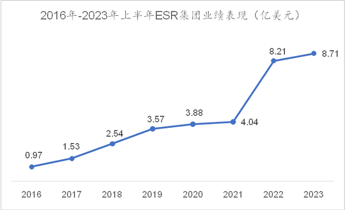 ESR集团(易商)于2019年11月登陆香港联交所,自2016年开始,ESR集团的业绩一直保持稳定增长。营业收入由2016年的0.97亿美元增长至2023年8.71亿美元。