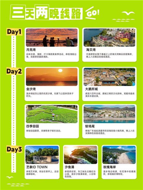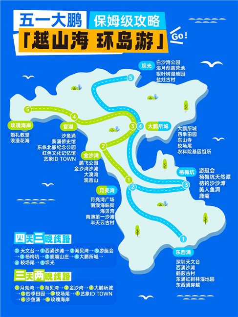 深圳新闻网2024年4月22日讯(记者 周维朕)五一快到了,想要出游的心已经按捺不住了!美好的假期去哪里好呢?别急,大鹏新区精心设计了大鹏3天2晚特色线路,无论是结伴游还是自由行,你都能度过一段充实美好的假日。