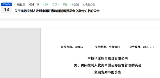 2024-04-13中核钛白[002145]:关于实际控制人收到中国证券监督管理委员会立案告知书的公告