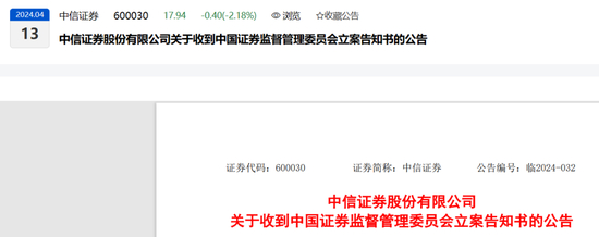 2024-04-13中信证券 [600030]:中信证券股份有限公司关于收到中国证券监督管理委员会立案告知书的公告