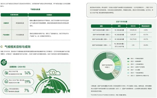 一方面,新报告插入了大量的图表设计,结构化地呈现内容,清晰直观;另一方面,新报告用数据说话的意识明显增强,一些关键议题都有数据支撑和基准比对。例如针对气候相关目标与成效,茅台披露了2024年的目标,对比基准是2020年;对于2023年温室气体排放量的披露,数据详实。