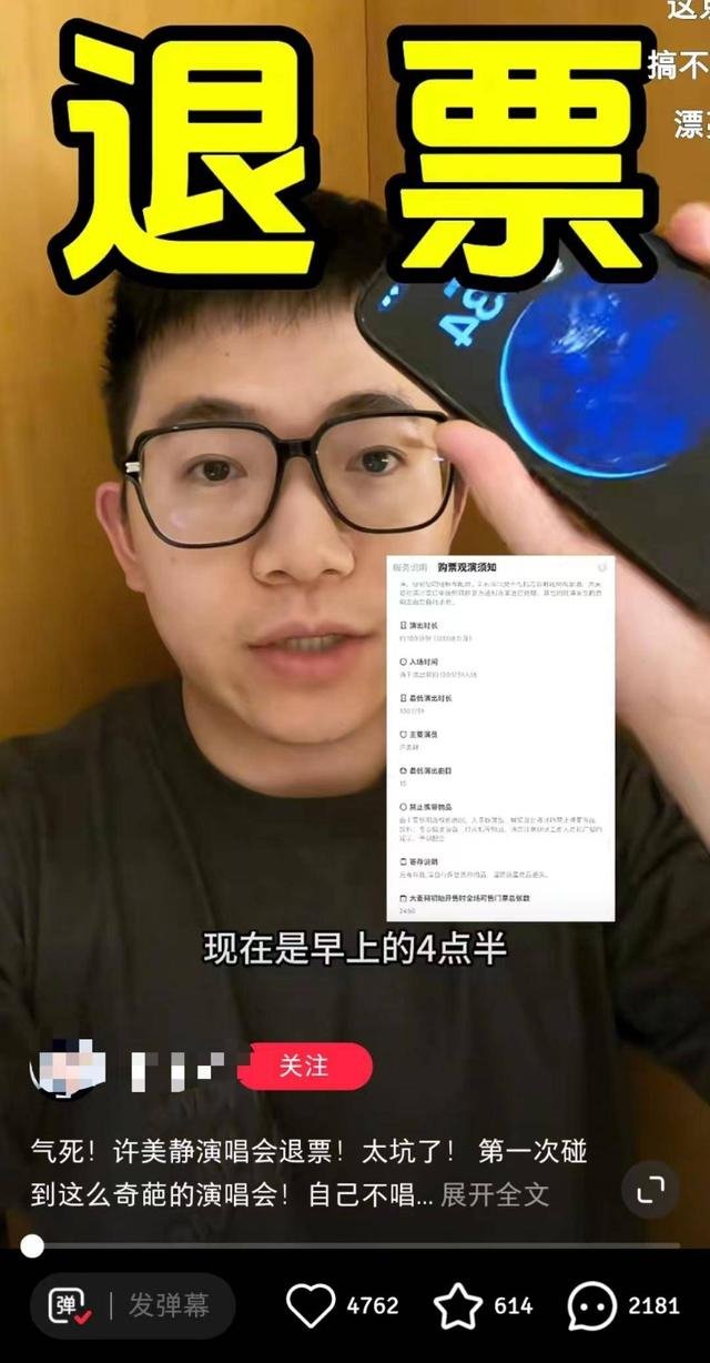 对于这场演出,陈女士认为确实看得出许美静身体不好,“少唱几首我其实可以接受。”现场有不少人在高声喊要“退票”的情况也是属实的,“我旁边有两个女生一直在说退票退票,许美静从此失去了我之类的,我耳朵被他们聒噪了一小时,但也没好意思说,感觉挺刻薄的。我坦白的讲,人和人之间还是多一分善意,不要太刻薄了。”