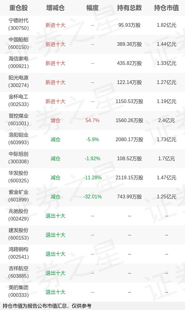 证券之星消息,4月22日海富通基金旗下周雪军管理的海富通改革驱动灵活配置混合型基金公布一季报,近1年净值增长率-12.41%。与上一季度相比,该基金前十大重仓股新增宁德时代中国船舶,海信家电,阳光电源,金杯电工;并对晋控煤业增仓551.67万股,为该基金第一大重仓股;兆驰股份,建发股份,鸿路钢构,吉祥航空美的集团等退出前十大重仓股;详细数据如下: