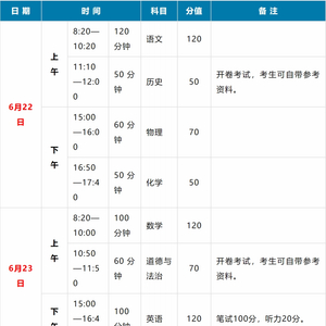 今年中招考试时间为6月22日—24日。具体科目考试时间和分值如下: