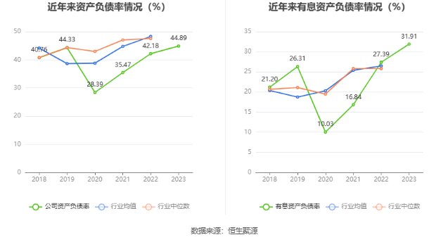 在偿债能力方面,公司2023年年末资产负债率为44.89%,相比上年末上升2.71个百分点;有息资产负债率为31.91%,相比上年末上升4.52个百分点。