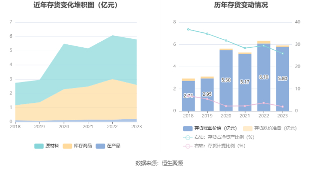 从存货变动来看,截至2023年年末,公司存货账面价值为5.8亿元,占净资产的26.0%,较上年末减少2939.33万元。其中,存货跌价准备为1222.87万元,计提比例为2.06%。