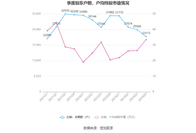 筹码集中度方面,截至2023年年末,公司股东总户数为2.31万户,较三季度末下降了2870户,降幅11.04%;户均持股市值由三季度末的26.54万元上升至33.53万元,增幅为26.34%。