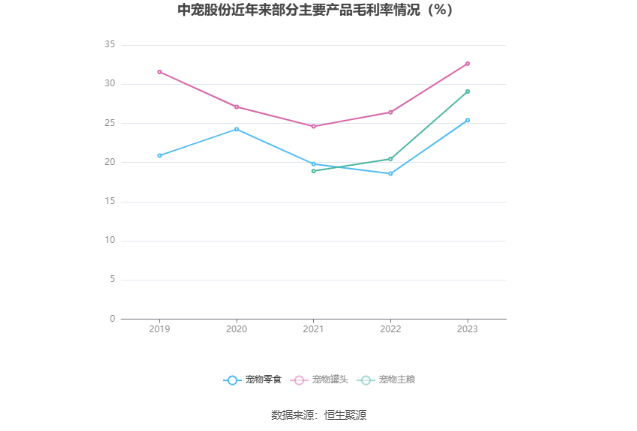 分产品看,宠物零食、宠物罐头、宠物主粮2023年毛利率分别为25.39%、32.62%、29.06%。