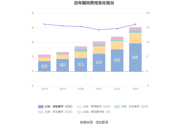 2023年,公司期间费用为6.07亿元,同比增长1.29亿元;期间费用率为16.21%,同比增长1.5个百分点。其中,销售费用同比增长27.71%,管理费用同比增长23.19%,研发费用同比增长10.48%,财务费用同比增长92.6%。