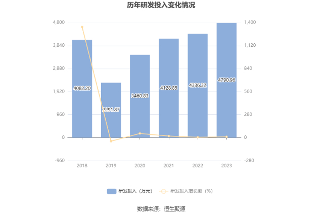2023年全年,公司研发投入金额为4790.96万元,同比增长10.48%;研发投入占营业收入比例为1.28%,相比上年同期下降0.06个百分点。此外,公司全年研发投入资本化率为0。