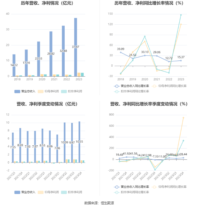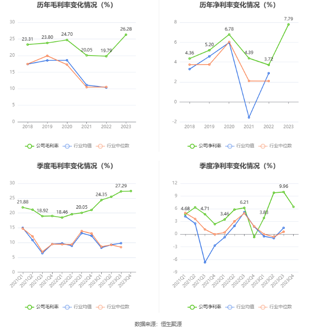 2023年,公司毛利率为26.28%,同比上升6.49个百分点;净利率为7.79%,较上年同期上升4.07个百分点。从单季度指标来看,2023年第四季度公司毛利率为27.40%,同比上升6.37个百分点,环比上升0.11个百分点;净利率为6.47%,较上年同期上升7.18个百分点,较上一季度下降3.49个百分点。