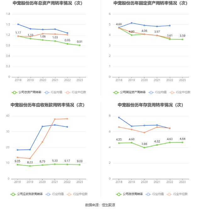 营运能力方面,2023年,公司公司总资产周转率为0.91次,上年同期为0.95次(2022年行业平均值为1.26次,公司位居同行业14/17);固定资产周转率为3.59次,上年同期为3.61次(2022年行业平均值为4.91次,公司位居同行业11/17);公司应收账款周转率、存货周转率分别为9.03次、4.64次。