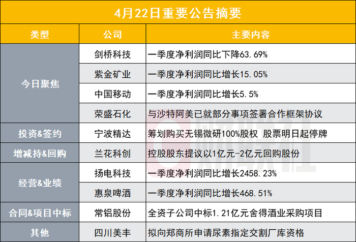 恒力石化公告,控股股东与沙特阿美签署谅解备忘录,双方正在讨论沙特阿美拟向恒力集团收购其所持有的占公司已发行股本10%加一股的股份;以及恒力集团将支持和促使公司与沙特阿美在原油供应、原料供应、产品承购、技术许可等方面进行战略合作。同日披露2024年第一季度报告,一季度净利润21.4亿元,同比增长109.8%。