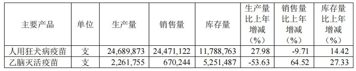 同年,成大生物人用狂犬病疫苗的生产量和销售量分别为2468.99万支、2447.11万支,产销率为99.11%,销售量同比减少9.71%。